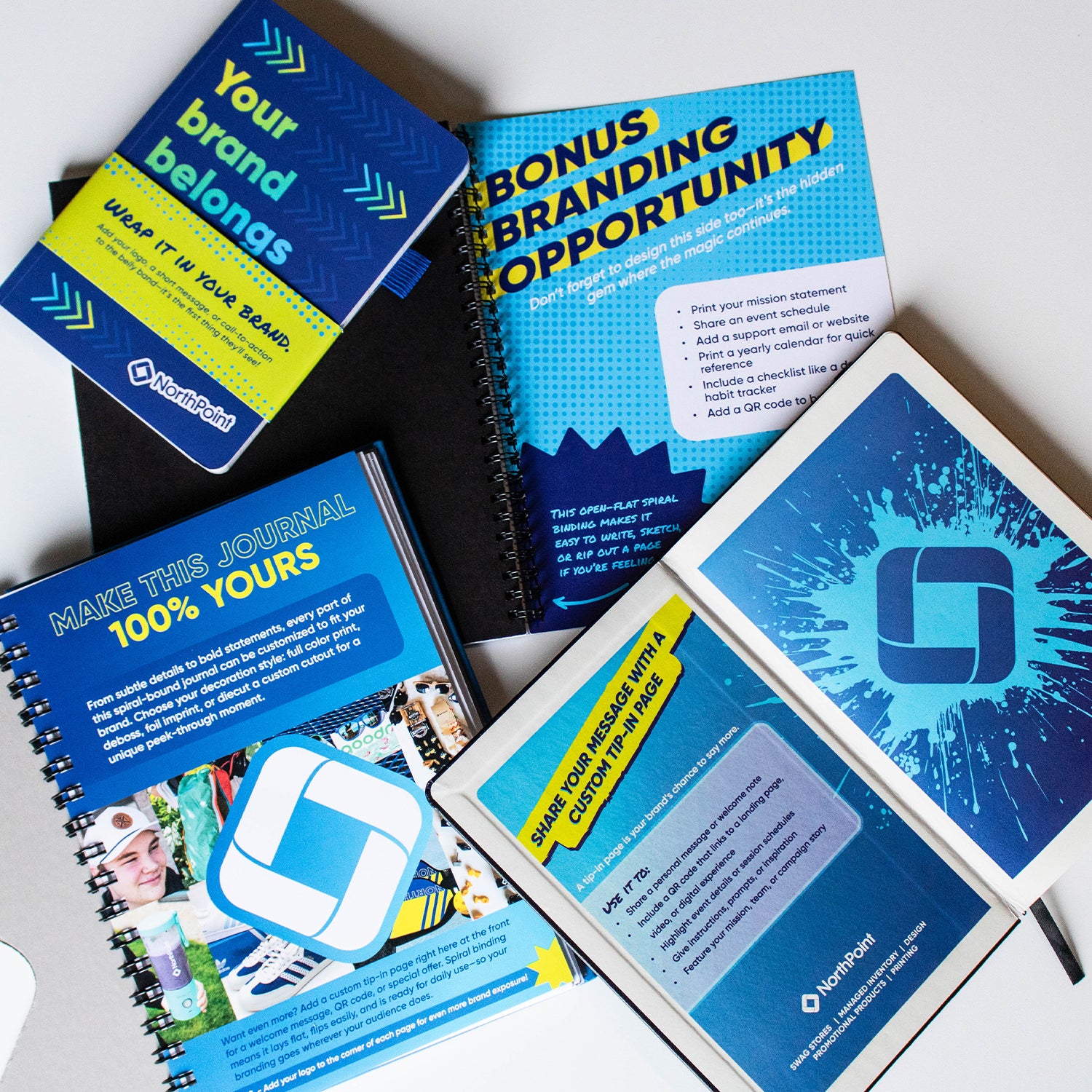 With options like full-color covers, foil stamping, debossing, custom cut-outs, and tip-in pages, this bundle lets you get as bold (or as subtle) as you want. Perfect for onboarding kits, client gifts, or event giveaways, these notebooks take a "basic" swag staple to a new level!